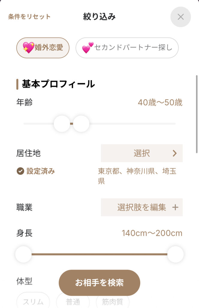 マッチングアプリ特有の機能で、プロフィールを絞ることができます。そこで、首都圏の40歳~50歳という、これまた婚外をしそうな世代の女性を検索してみましたよ。